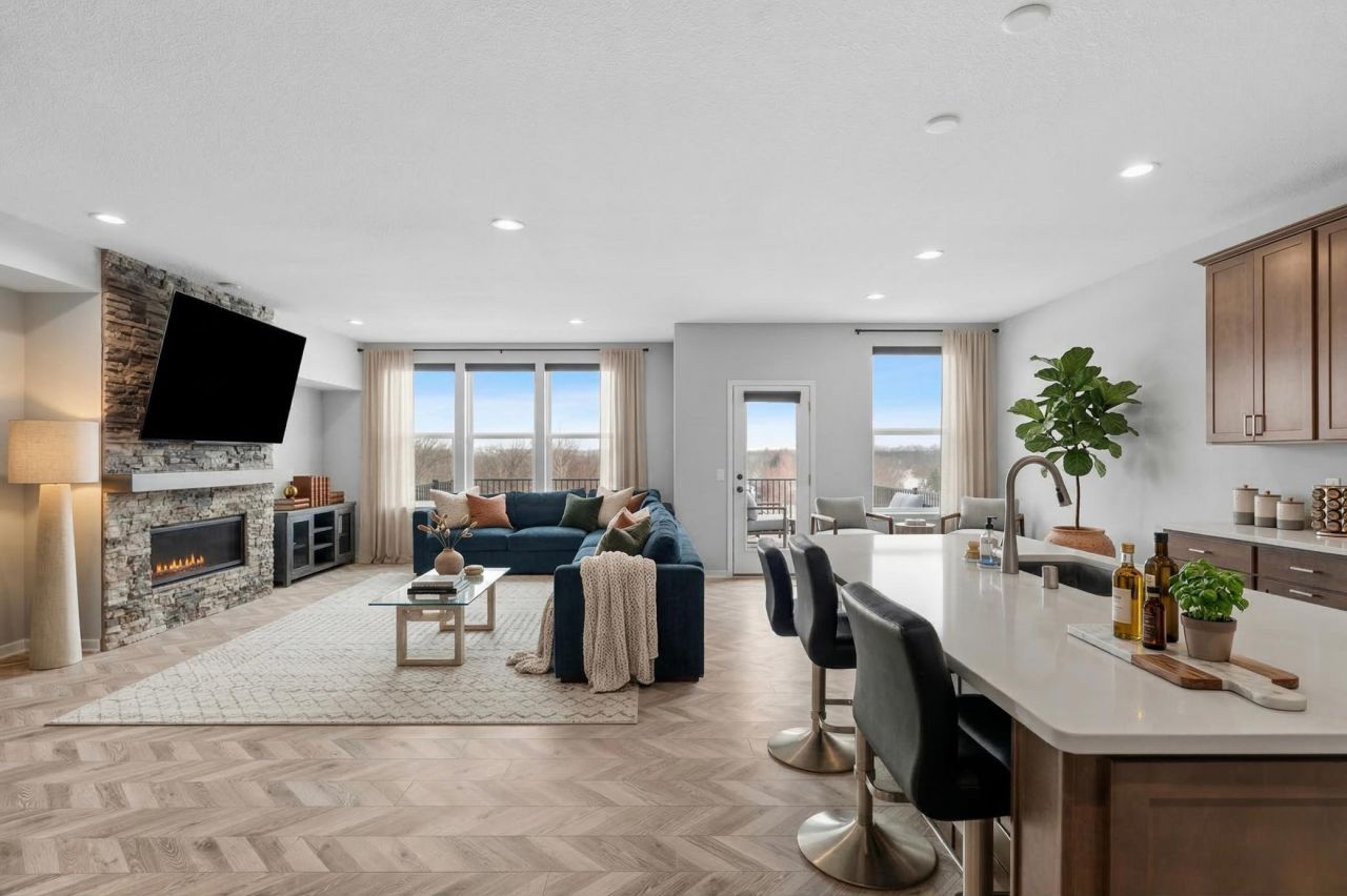 Welcome home to an absolute gem nestled in the coveted Glenview Farm community, located in the sought-after 833 School District and feeding into Eastridge High School. This stunning two-story home blends style, space, and scenic views into one exceptional living experience. From the moment you step inside, herringbone-patterned flooring guides you through a bright, open-concept layout anchored by a breathtaking floor-to-ceiling stone fireplace. Entertaining is effortless with both formal and informal dining spaces, all flowing seamlessly to a massive maintenance-free deck perched on a hilltop?an ideal spot to take in unforgettable Woodbury sunsets. The kitchen is a true chef's dream, featuring a gourmet design with quartz countertops and ample prep space to bring your favorite meals to life. The main level also offers incredible flexibility with a home office or additional bedroom, complete with a closet. Upstairs, you'll find four generously sized bedrooms and a versatile loft. The owner's suite is a retreat of its own, highlighted by a thoughtfully designed 'his and hers setup with dual vanities and two walk-in closets, along with an updated spa-like bath featuring a tiled walk-in shower. The expansive walkout lower level offers endless potential?imagine an additional bedroom, a spacious family room, or over 1,000 more finished square feet tailored to your lifestyle. Outside, a newly added patio invites you to enjoy Minnesota skies from sunrise to sunset, rain or shine. This home perfectly balances luxury and comfort, with modern upgrades, breathtaking views, and everything Woodbury has to offer just moments away. Welcome to your Woodbury dream