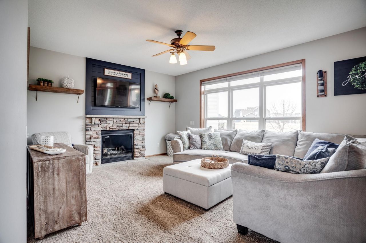 Welcome to a stunning 2 story in Clover Springs of Delano. This residence offers an ideal blend of space, comfort, and modern living. There is ample room for everyone to enjoy a relaxed lifestyle. The home is thoughtfully designed with an inviting layout. The living areas are bright and airy, perfect for both entertaining and serene everyday living. The property is situated on a desirable lot with easy access to local conveniences and amenities. The recently refreshed kitchen has ample cabinetry, updated sink/faucet, newer appliances, buffet, tile backsplash, and gorgeous, quartz center island. The beautiful main floor great room is highlighted with large windows and an attractive fireplace. Unwind in the vaulted owner's suite with elegant bath and large walk-in closet. The recently finished basement has a wonderful bar/kitchenette space with adjoining game area and a large family/media room with built-in shelves plus great storage & surround sound. Enjoy the outdoors from the beautiful deck and large paver patio with brick planters & built-in firepit. Don't miss out on this outstanding opportunity to own a property that meets all your needs.
